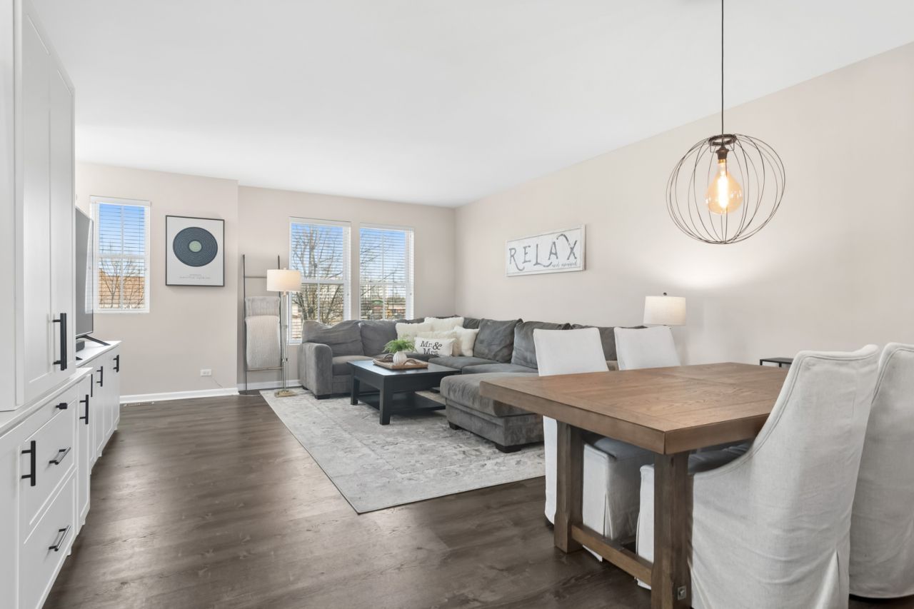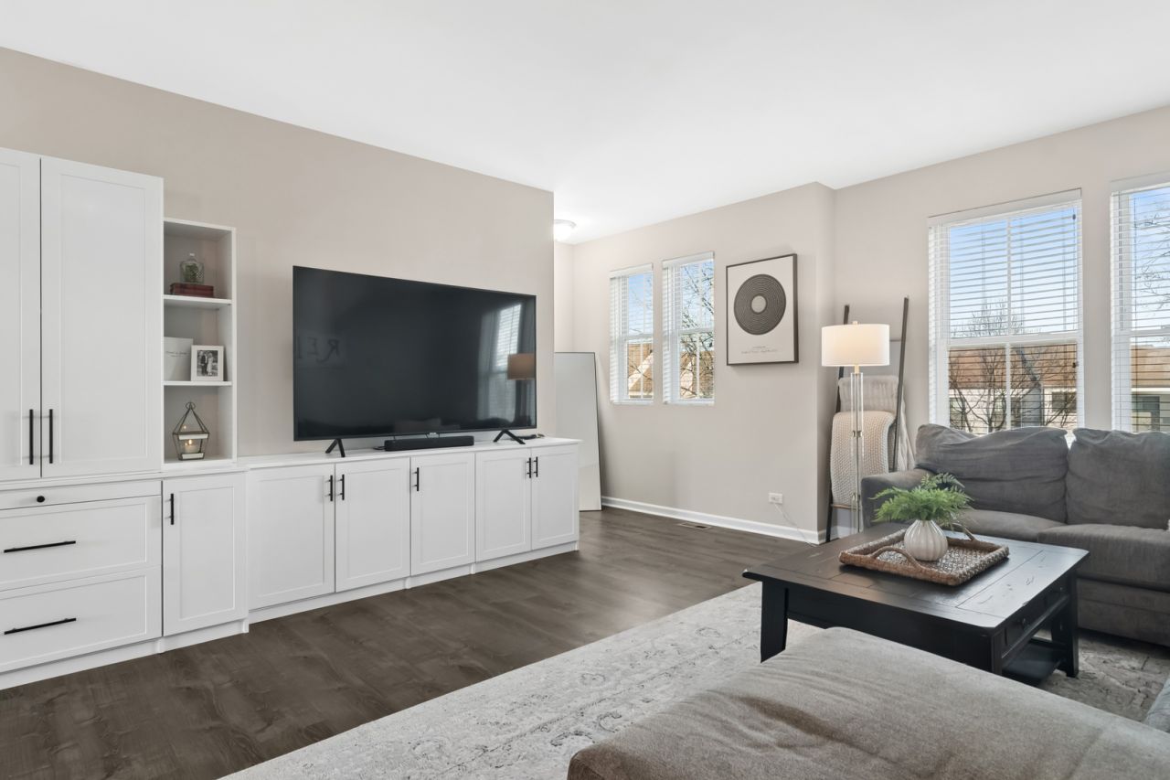 Prepare to be impressed by this spectacular sun-drenched, end-unit townhome nestled in the Arlington Reserve Subdivision, offering 3 bedrooms, 2 full and 2 half baths and approximately 2,025 square feet of thoughtfully designed living space. The very sizable and gorgeous living room/dining room combination is anchored by a classic custom white built-in cabinet perfectly sized for a 65 TV, complete with a tucked-away workstation, abundant storage and display shelving for all your momentums. The open and airy main living floor also showcases the spectacular fully appointed large kitchen featuring 42 cabinetry, granite countertops, newer dark stainless-steel appliances, a substantial center island and a serving/breakfast bar. Step out onto your oversized private balcony, ideal for grilling and relaxing with easy access to your garage and neighborhood. To complete the main floor, you will also find your laundry room equipped with a full-size washer and dryer and an adorable powder room. Head upstairs to your expansive primary suite boasting a dual vanity, two closets and blackout shades, along with two additional bedrooms and a full bath. The versatile lower-level impresses with luxury vinyl flooring, newly installed built-in cabinetry, two beverage refrigerators - the perfect place for a home office, recreation room, exercise space, or the ultimate game day retreat. Topping it all off you will also find another powder room, three large closets and direct access to your attached 2-car garage. Enjoy a prime location just minutes from parks, schools, shopping, Busse Woods, downtown Arlington Heights filled with restaurants/shops and easy access to I-90, O'Hare, and Chicago. This home truly has it all!